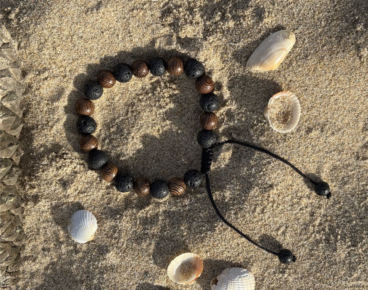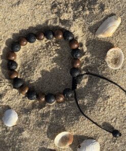- Couleurs : Noir profond de la pierre de lave associé aux tons de brun des perles de bois